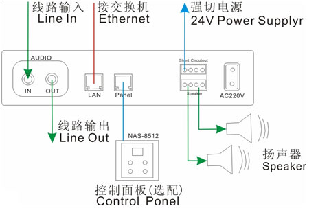 壁掛安裝,將網(wǎng)絡(luò )音頻轉換為模擬音頻送至功放或功率放大至定阻揚聲器。